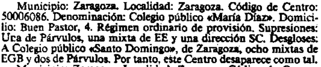 En el BOE del martes 3 de febrero de 1987 se publicaba la supresión del Colegio Público María Díaz Lizardi. El alumnado que quedaba pasó al Colegio Santo Domingo de la calle Predicadores.