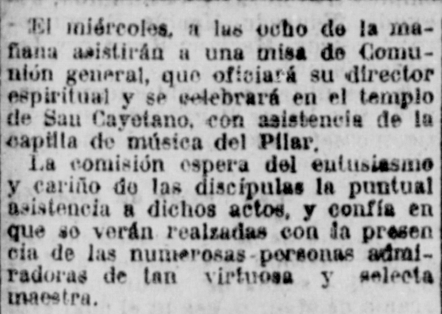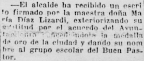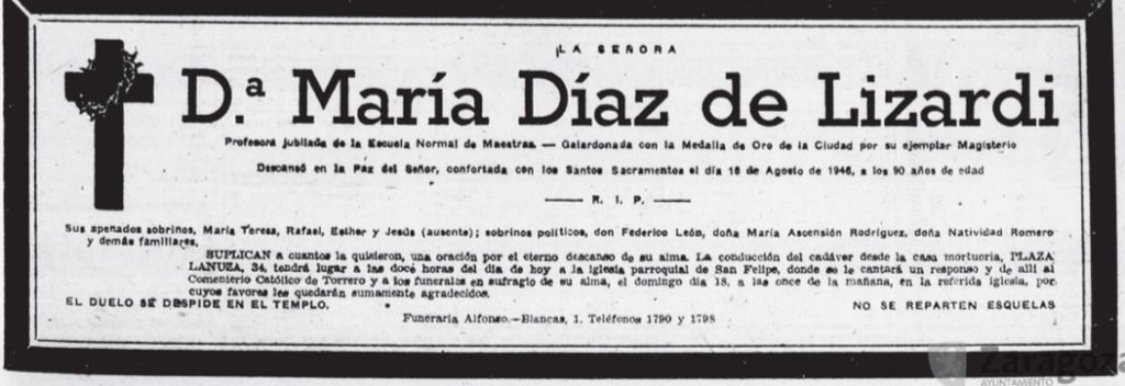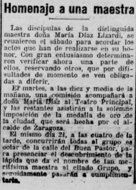 «Homenaje de gratitud a la excelsa maestra que con gran abnegación guió a centenares de niñas hacia el bien y la instrucción. Sus discípulas perpetúan el nombre de quien les iluminó el corazón y la inteligencia con sus sabias enseñanzas y ejemplares virtudes. Zaragoza 21 de octubre de 1919. DOÑA MARÍA DIAZ LIZARDI».