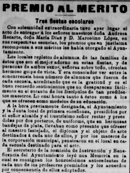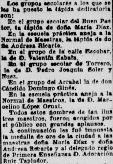 Ella y Andresa Recarte fueron las únicas mujeres entre los maestros a los que se les colocó la «lápida» en un centro (los otros fueron Valentín Zabala en la escuela de la calle Escobar, Pedro Joaquín Soler en la de Torreo, Cándido Domingo en el Arrabal y Marcelino López Ornat en la aneja a la Escuela Normal de Maestros).