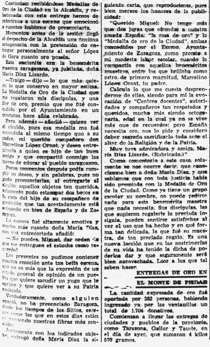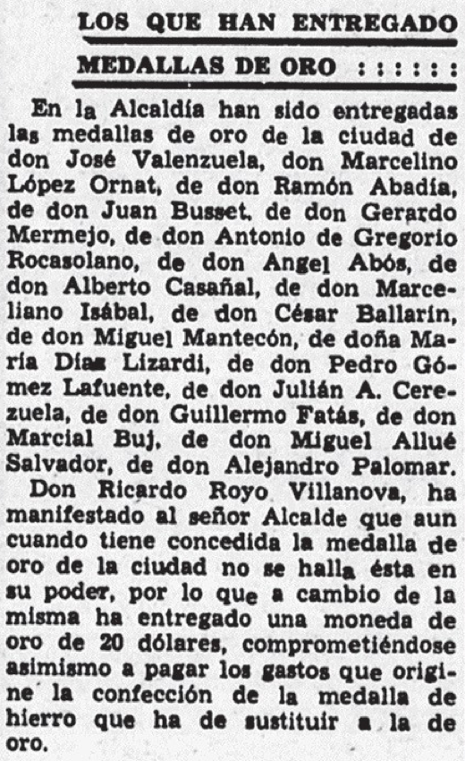 En 1936 entregó su medalla de oro en el Ayuntamiento de la ciudad como respuesta a la petición de oro que desde allí se hacía.