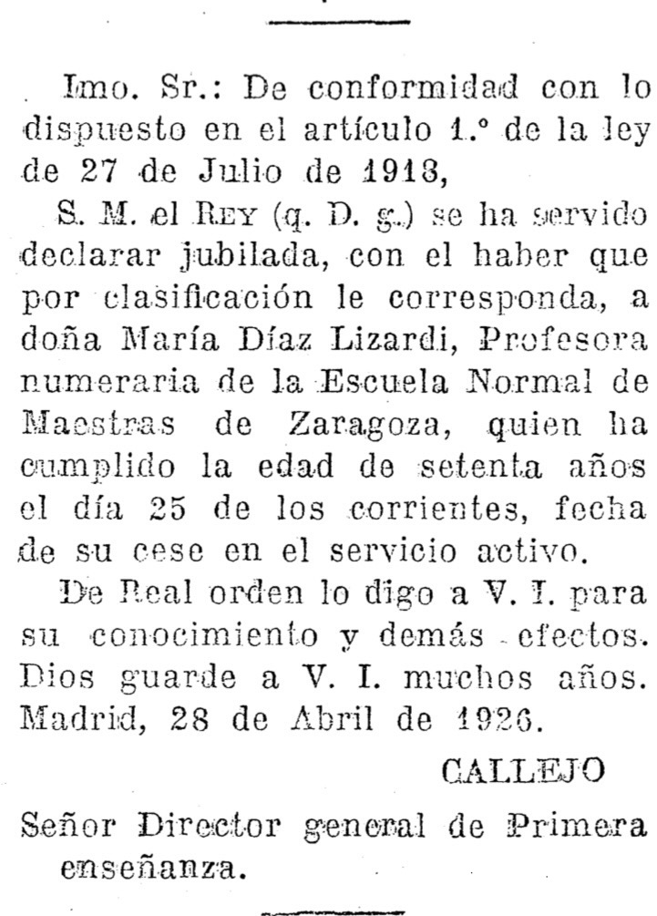 En 1921 era la vigesimocuarta, siendo profesora de matemáticas de la Escuela Normal de Zaragoza y pasaba a cobrar 12.000 pesetas anuales.
