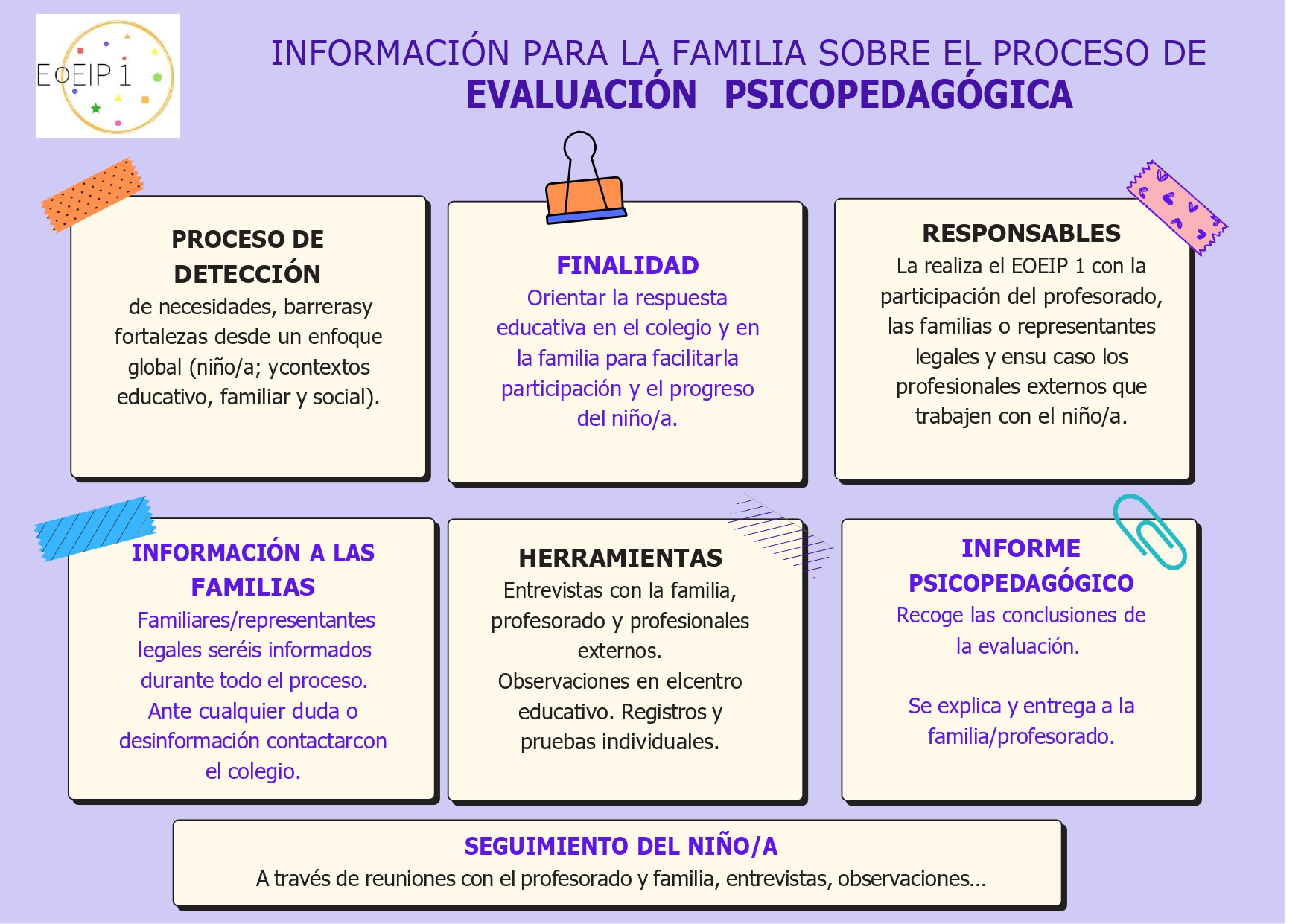 En el caso de sospecha de discapacidad o necesidad de aplicar actuaciones de intervención específicas se procede a la realización de evaluación psicopedagógica, para lo que se informa a la familia del proceso que se va a llevar a cabo.