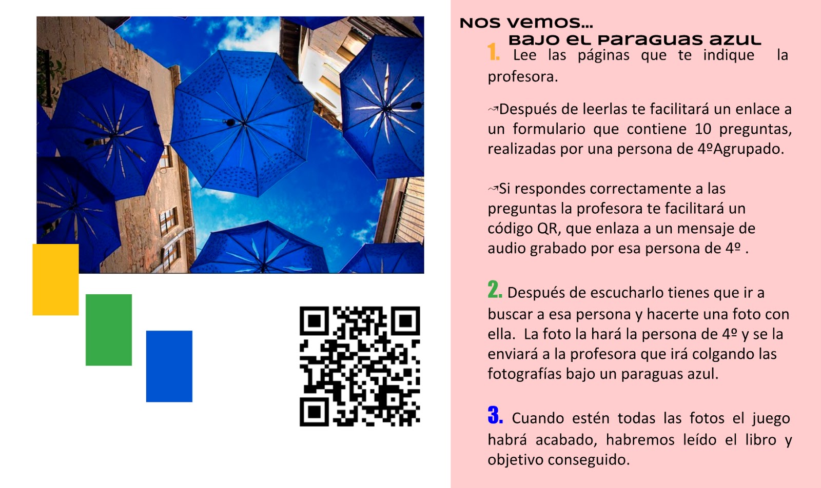 Durante este primer trimestre el grupo de 1º PAI va a leer el libro titulado: Bajo el paraguas azul, escrito por Elena Martínez Blanco. Los alumnos de 4º Agrupado del IES Cabañas hemos preparado un juego para acompañaros en la lectura.