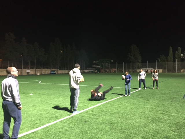 Primera sesión práctica del curso en la que comenzamos con Rugby un deporte noble y muy reglado. De la mano de Héctor entrenador del club de Rugby Quebrantahuesos aprendimos las nociones básicas de este divertido aunque algo complicado deporte. Lo primero fue la toma de contacto con la conocida y ovalada pelota, un poco de juego combinativo para más tarde pasar a los placajes y por último a las situaciones de juego. Lo pasamos bien como siempre, aprendimos como siempre y pasamos algo de frío pero mereció la pena. Agradecer al Club Quebrantahuesos de la mano de Héctor su disposición y amabilidad para poder realizar esta sesión.